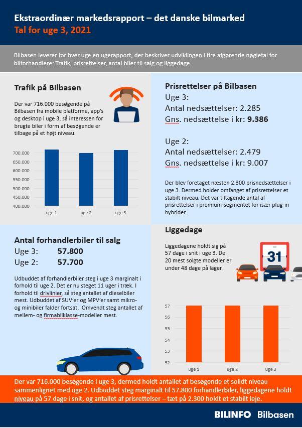 I korte træk: Der var 716.000 besøgende i uge 3, dermed holdt antallet af besøgende et solidt niveau, sammenlignet med uge 2. Udbuddet steg marginalt til 57.800 forhandlerbiler, liggedagene holdt níveau på 57 dage i snit, og antallet af prisrettelser – tæt på 2.300 holdt et stabilt leje.