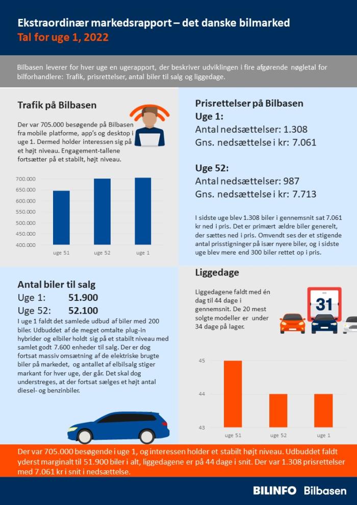 I korte træk: Der var 705.000 besøgende i uge 1, og interessen holder et stabilt højt niveau. Udbuddet faldt yderst marginalt til 51.900 biler i alt, liggedagene er på 44 dage i snit. Der var 1.308 prisrettelser med 7.061 kr i snit i nedsættelse.