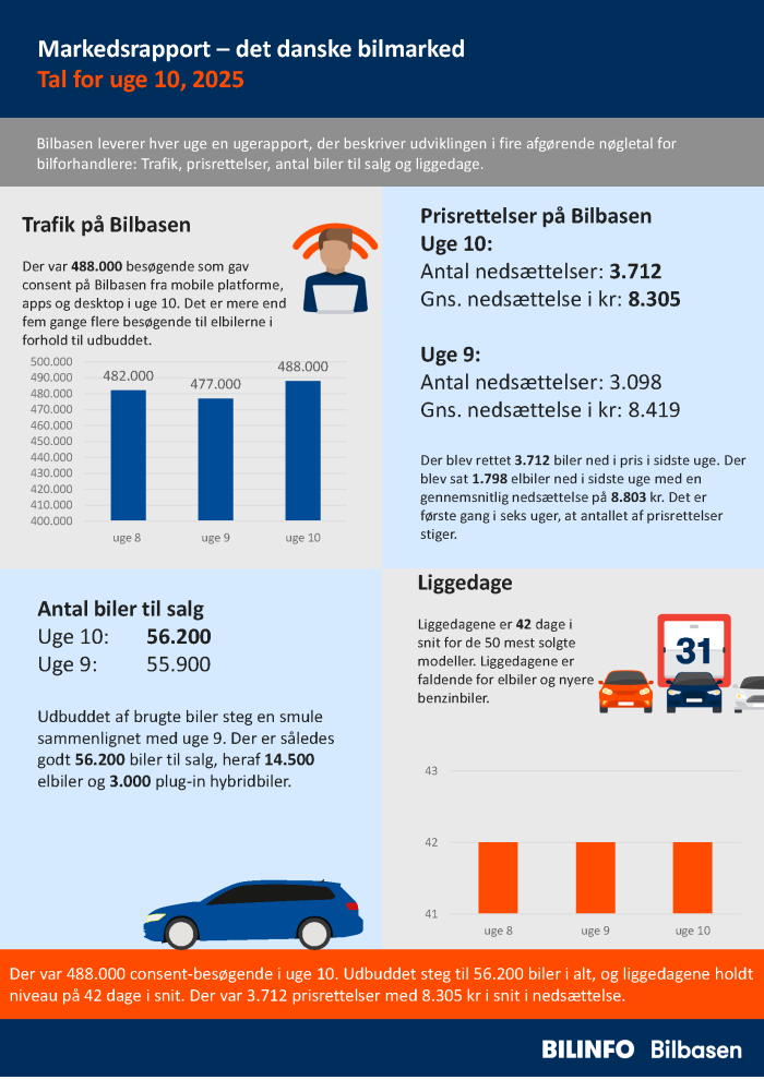 Der var 488.000 consent-besøgende i uge 10. Udbuddet steg til 56.200 biler i alt, og liggedagene holdt niveau på 42 dage i snit. Der var 3.712 prisrettelser med 8.305 kr i snit i nedsættelse.
