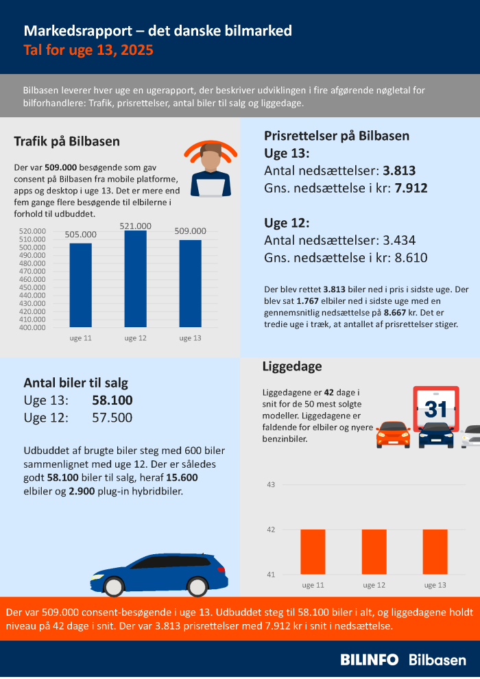 Der var 509.000 consent-besøgende i uge 13. Udbuddet steg til 58.100 biler i alt, og liggedagene holdt niveau på 42 dage i snit. Der var 3.813 prisrettelser med 7.912 kr i snit i nedsættelse.