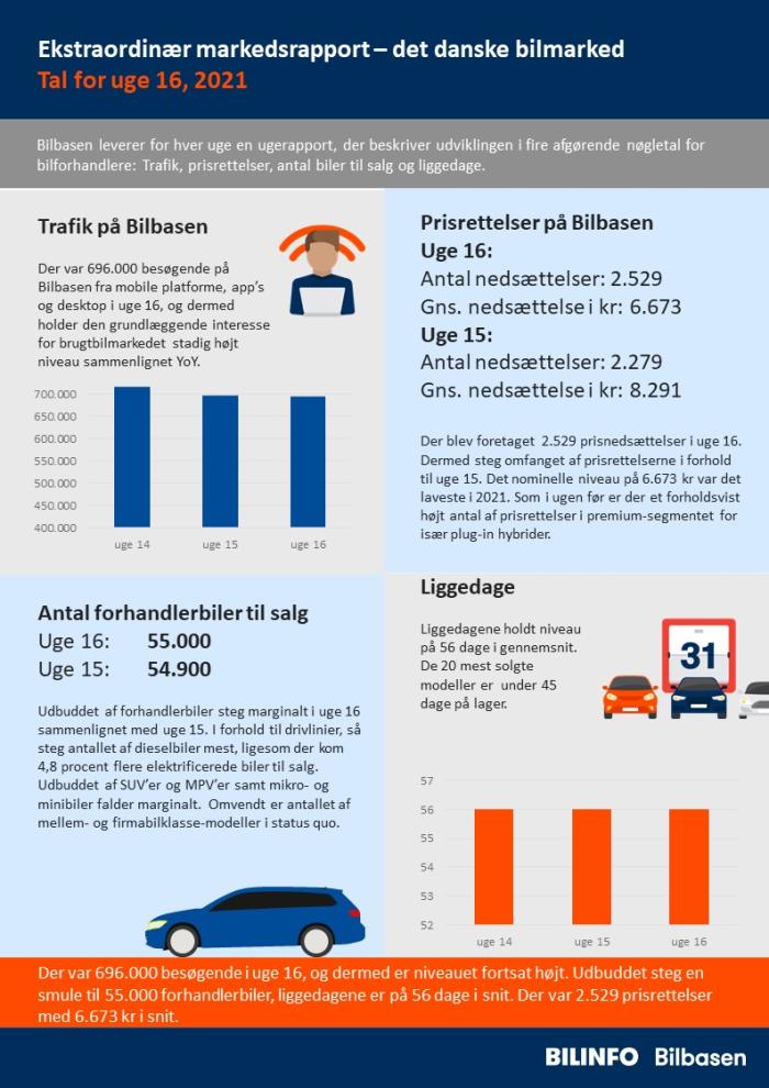 I korte træk: Der var 696.000 besøgende i uge 16, og dermed er niveauet fortsat højt. Udbuddet steg en smule til 55.000 forhandlerbiler, liggedagene er på 56 dage i snit. Der var 2.529 prisrettelser med 6.673 kr i snit.
