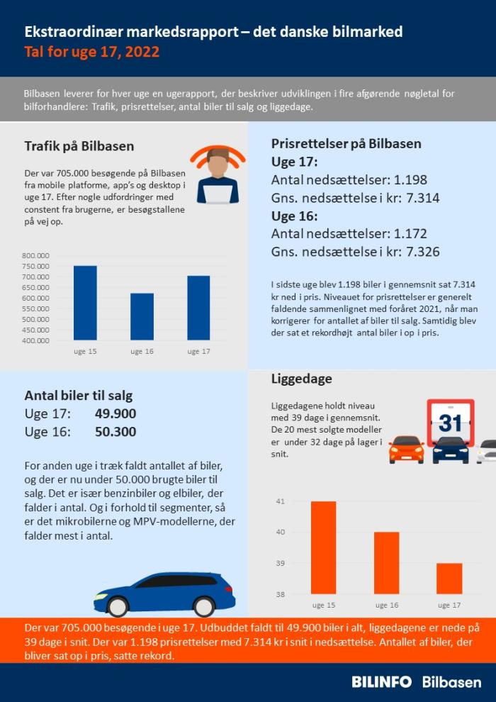 Der var 705.000 besøgende i uge 17. Udbuddet faldt til 49.900 biler i alt, liggedagene er nede på 39 dage i snit. Der var 1.198 prisrettelser med 7.314 kr i snit i nedsættelse. Antallet af biler, der bliver sat op i pris, satte rekord.