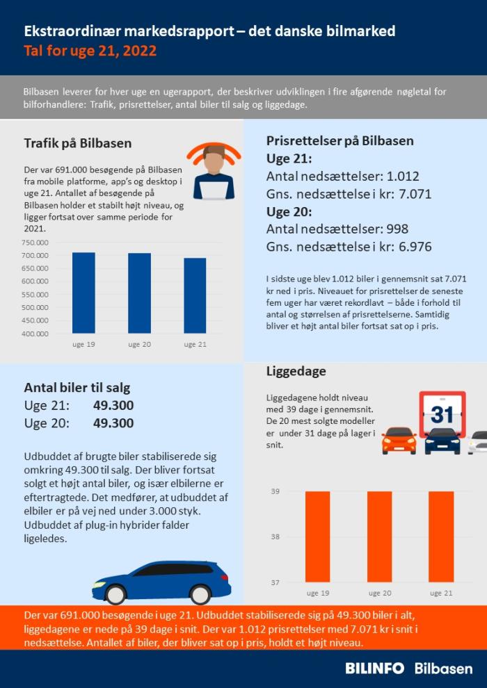 I korte træk: Der var 691.000 besøgende i uge 21. Udbuddet stabiliserede sig på 49.300 biler i alt, liggedagene er nede på 39 dage i snit. Der var 1.012 prisrettelser med 7.071 kr i snit i nedsættelse. Antallet af biler, der bliver sat op i pris, holdt et højt niveau.