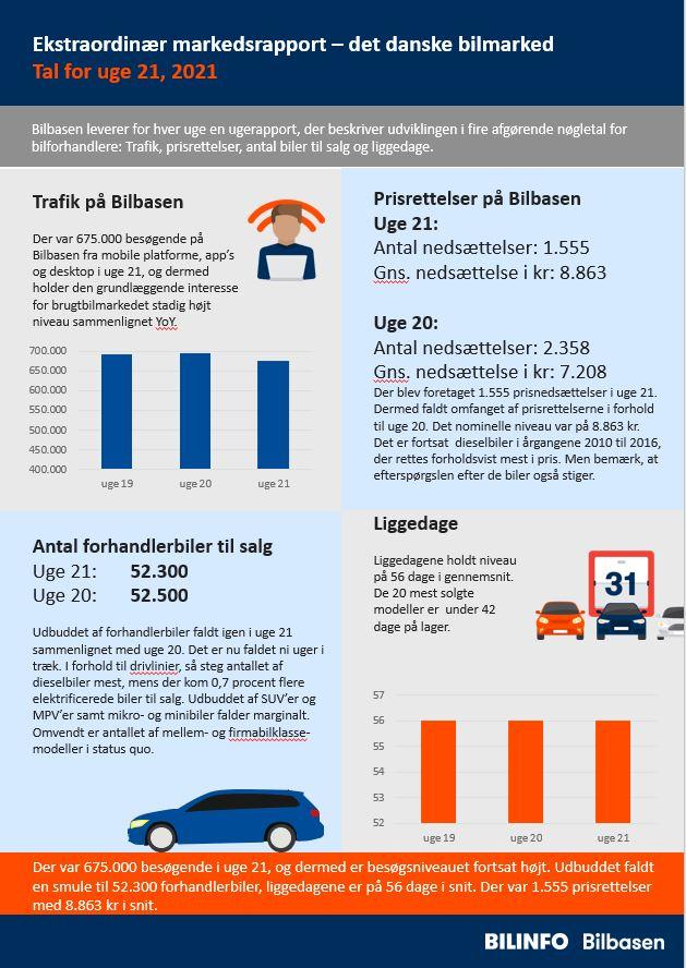 I korte træk: Der var 675.000 besøgende i uge 21, og dermed er besøgsniveauet fortsat højt. Udbuddet faldt en smule til 52.300 forhandlerbiler, liggedagene er på 56 dage i snit. Der var 1.555 prisrettelser med 8.863 kr i snit.