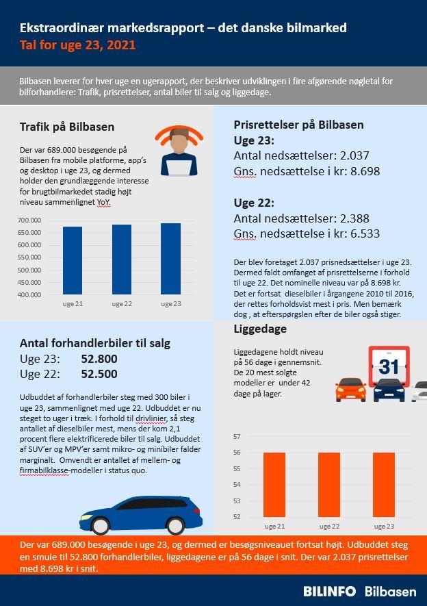 I korte træk for uge 22: Der var 689.000 besøgende i uge 23, og dermed er besøgsniveauet fortsat højt. Udbuddet steg en smule til 52.800 forhandlerbiler, liggedagene er på 56 dage i snit. Der var 2.037 prisrettelser med 8.698 kr i snit.