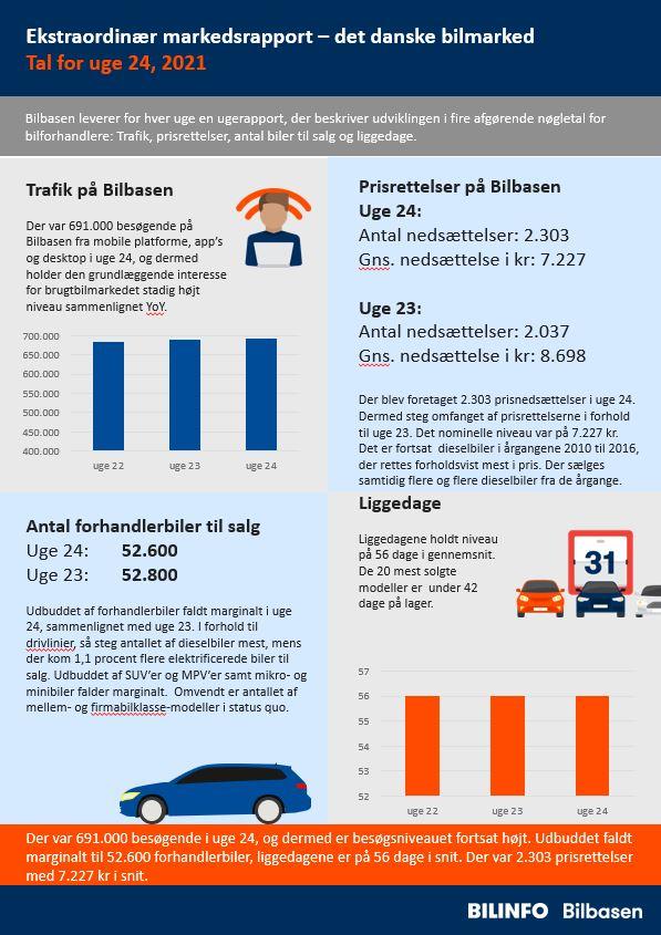 I korte træk for uge 24: Der var 691.000 besøgende i uge 24, og dermed er besøgsniveauet fortsat højt. Udbuddet faldt marginalt til 52.600 forhandlerbiler, liggedagene er på 56 dage i snit. Der var 2.303 prisrettelser med 7.227 kr i snit.