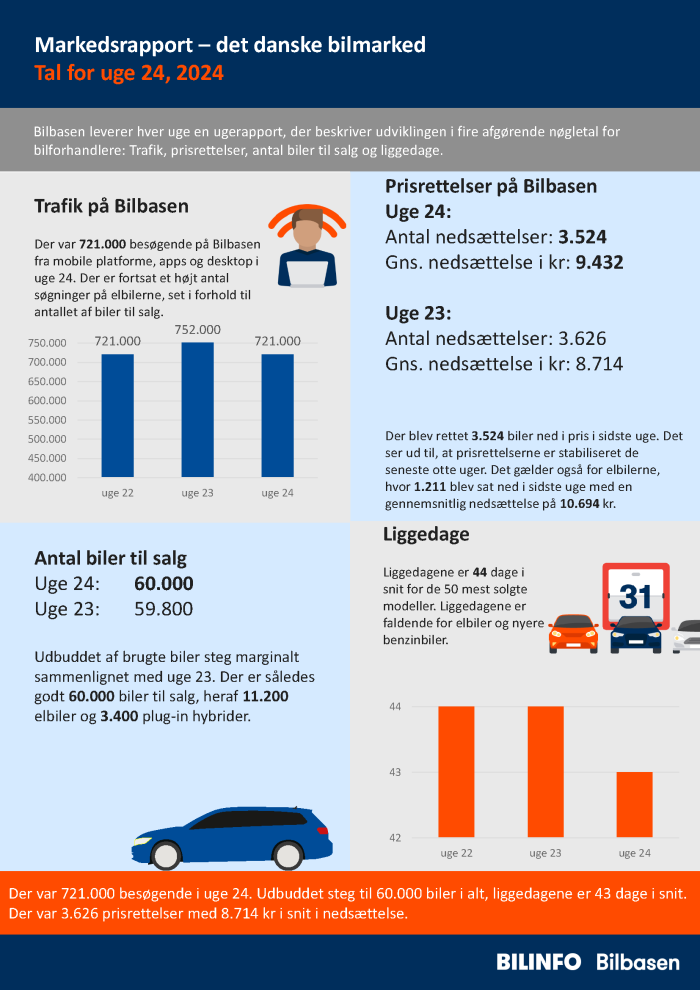 Der var 721.000 besøgende i uge 24. Udbuddet steg til 60.000 biler i alt, liggedagene er 43 dage i snit. Der var 3.626 prisrettelser med 8.714 kr i snit i nedsættelse.