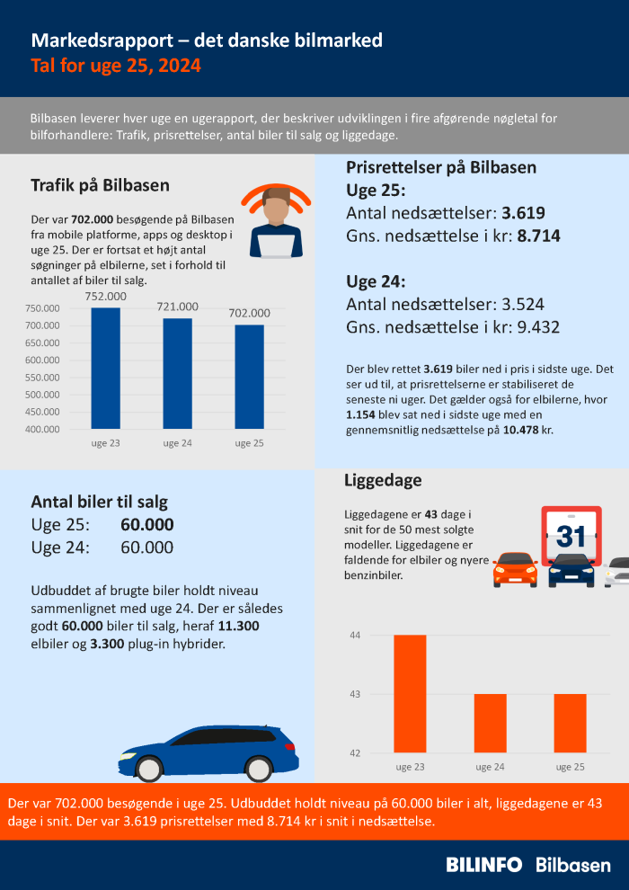 Der var 702.000 besøgende i uge 25. Udbuddet holdt niveau på 60.000 biler i alt, liggedagene er 43 dage i snit. Der var 3.619 prisrettelser med 8.714 kr i snit i nedsættelse.