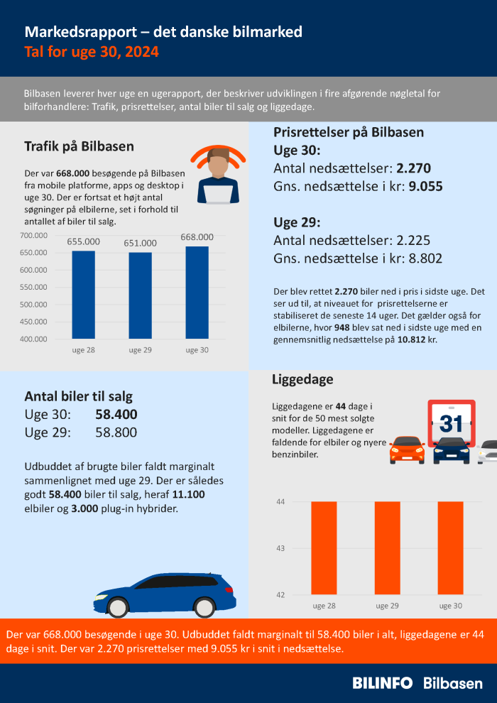 Der var 668.000 besøgende i uge 30. Udbuddet faldt marginalt til 58.400 biler i alt, liggedagene er 44 dage i snit. Der var 2.270 prisrettelser med 9.055 kr i snit i nedsættelse.