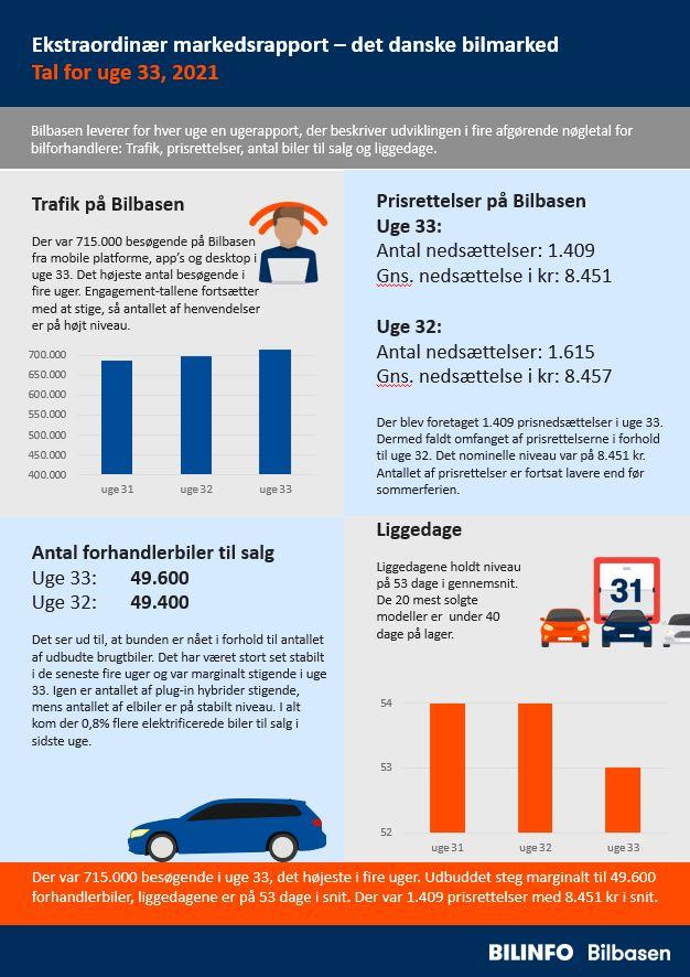 I korte træk for uge 33: Der var 715.000 besøgende i uge 33, det højeste i fire uger. Udbuddet steg marginalt til 49.600 forhandlerbiler, liggedagene er på 53 dage i snit. Der var 1.409 prisrettelser med 8.451 kr i snit.