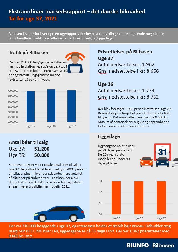I korte træk for uge 37: Der var 710.000 besøgende, og interessen holder et stabilt højt niveau. Udbuddet steg marginalt til 51.200 biler i alt, liggedagene er på 53 dage i snit. Der var 1.962 prisrettelser med 8.666 kr i snit.