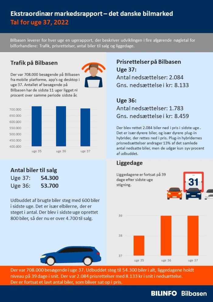 Der var 708.000 besøgende i uge 37. Udbuddet steg til 54.300 biler i alt, liggedagene holdt niveau på 39 dage i snit. Der var 2.084 prisrettelser med 8.133 kr i snit i nedsættelse.