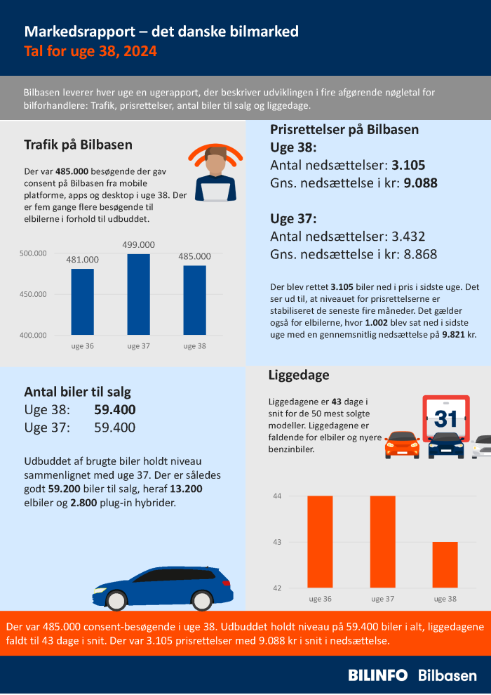 Der var 485.000 consent-besøgende i uge 38. Udbuddet holdt niveau på 59.400 biler i alt, liggedagene faldt til 43 dage i snit. Der var 3.432 prisrettelser med 8.868 kr i snit i nedsættelse.