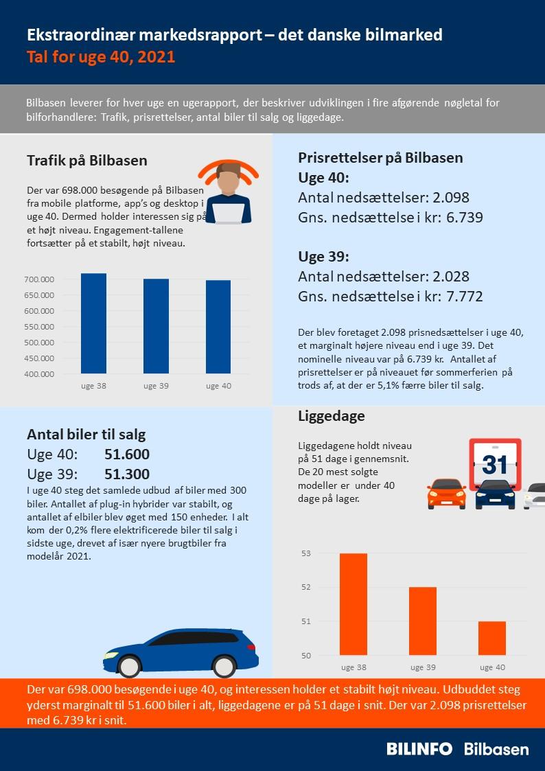 Der var 698.000 besøgende i uge 40, og interessen holder et stabilt højt niveau. Udbuddet steg yderst marginalt til 51.600 biler i alt, liggedagene er på 51 dage i snit. Der var 2.098 prisrettelser med 6.739 kr i snit.