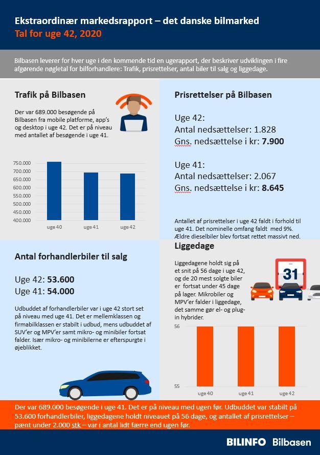 I korte træk: Der var 689.000 besøgende i uge 41. Det er på niveau med ugen før. Udbuddet var stabilt på 53.600 forhandlerbiler, liggedagene holdt niveauet på 56 dage, og antallet af prisrettelser – pænt under 2.000 stk – var i antal lidt færre end ugen før.
