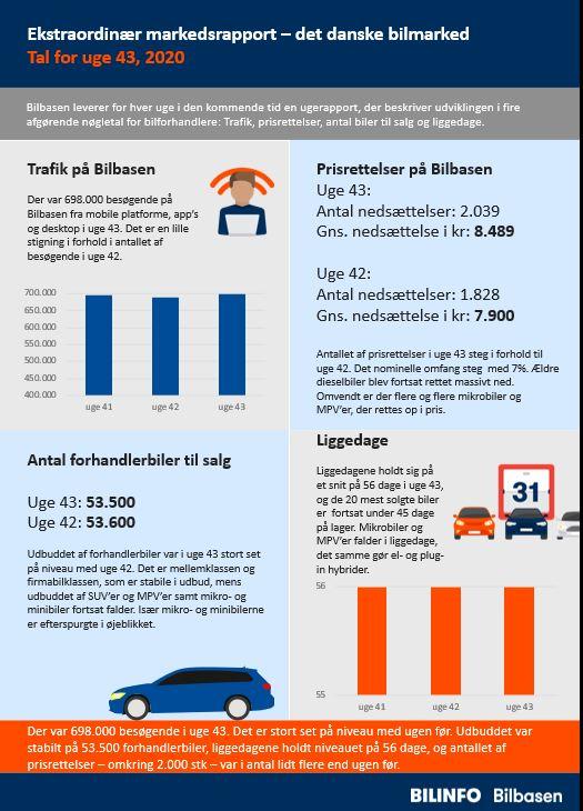 I korte træk: Der var 698.000 besøgende i uge 43. Det er stort set på niveau med ugen før. Udbuddet var stabilt på 53.500 forhandlerbiler, liggedagene holdt niveauet på 56 dage, og antallet af prisrettelser – omkring 2.000 stk – var i antal lidt flere end ugen før.