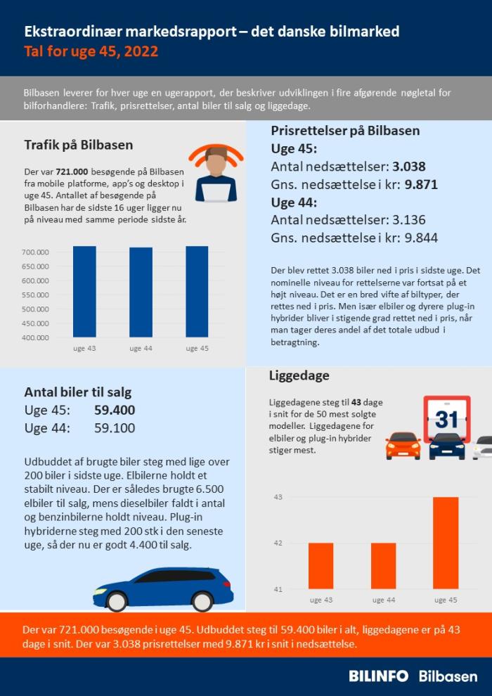 Der var 721.000 besøgende i uge 45. Udbuddet steg til 59.400 biler i alt, liggedagene er på 43 dage i snit. Der var 3.038 prisrettelser med 9.871 kr i snit i nedsættelse.