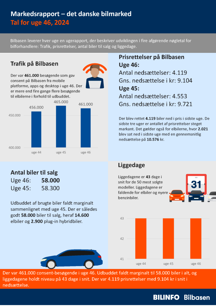 Der var 461.000 consent-besøgende i uge 46. Udbuddet faldt marginalt til 58.000 biler i alt, og liggedagene holdt niveauet på 43 dage i snit. Der var 4.119 prisrettelser med 9.104 kr i snit i nedsættelse.