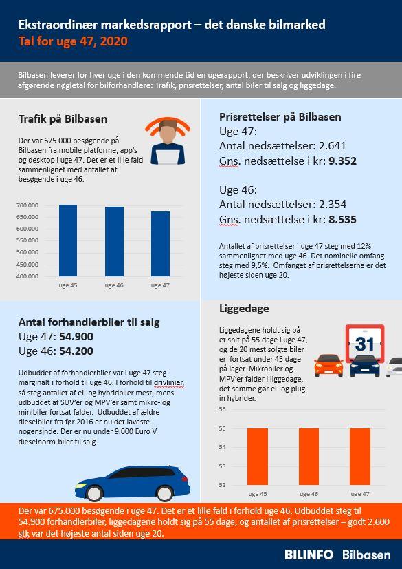I korte træk: Der var 675.000 besøgende i uge 47. Det er et lille fald i forhold uge 46. Udbuddet steg til 54.900 forhandlerbiler, liggedagene holdt sig på 55 dage, og antallet af prisrettelser – godt 2.600 stk var det højeste antal siden uge 20.