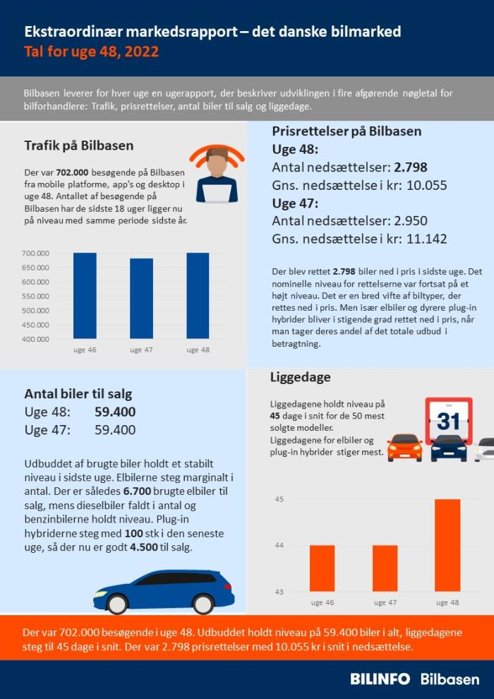 Der var 702.000 besøgende i uge 48. Udbuddet holdt niveau på 59.400 biler i alt, liggedagene steg til 45 dage i snit. Der var 2.798 prisrettelser med 10.055 kr i snit i nedsættelse.