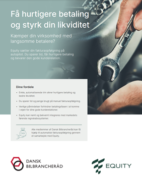 Med vores samarbejdsparter, Equity Credits, kan vi tilbyde Dansk Bilbrancheråds medlemmer et værktøj til at automatisere betalingspåmindelserne, således du som virksomhedsejer sparer masser af tid og får hurtigere betaling på dine fakturaer.
