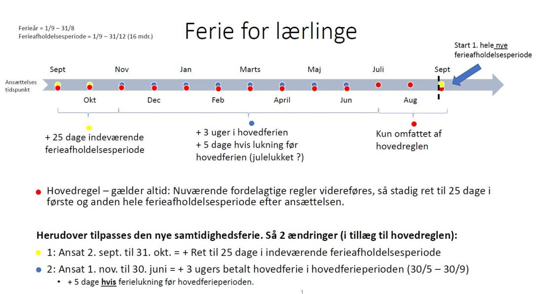 - Det betyder så også, at lærlinge, der er ansat i i perioden 1. juli til 1. september alene har ret til ferie efter den røde hovedregel.