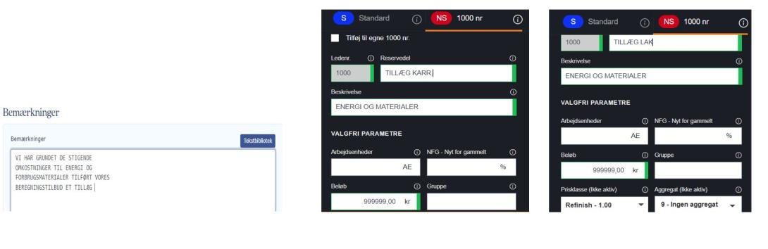 Tillægget noteres på reparationstilbuddet som 1000nr, og da man både er hovedleverandøren (skadesreparationsværkstedet) og underleverandør (autolakereren), der har øget omkostninger til energi og materialer, oprettes der henholdsvis et 1000nr. som E og et som L.
