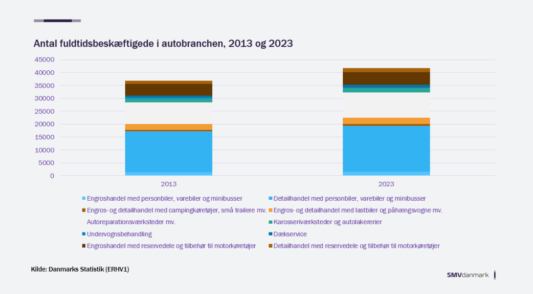 Samtidig er antallet af fuldtidsansatte i autobranchen steget fra ca. 36.000 i 2013 til 41.000 i 2023.