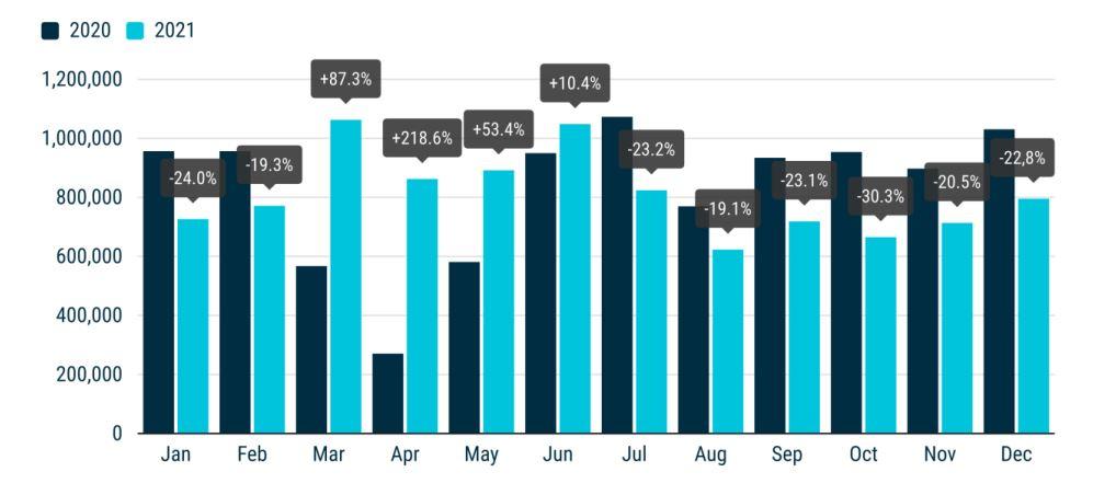 Faldet skyldes manglen på chips, hvilket påvirkede bilsalget gennem hele 2021, men specielt gennem sidste halvdel af 2021.