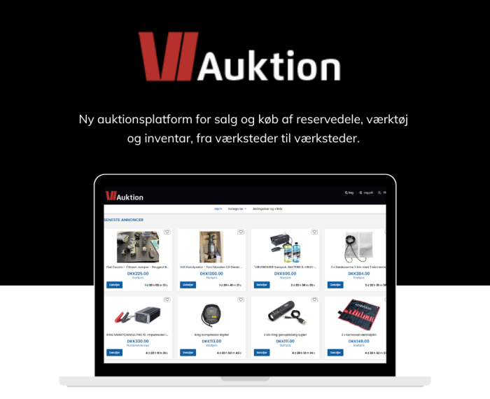 Auktionssiden faciliteres af VI, hvor en enkelt annoncering kun koster 30 kr. uanset varens størrelse, hvilket giver autoværkstederne en sikker og billig handelsplads.