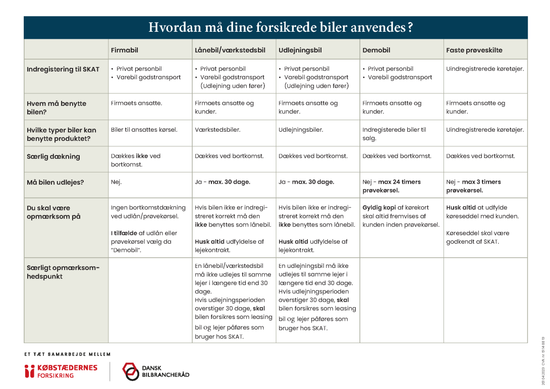 Se her, hvordan du må anvende dine forsikrede biler, hvis du er forsikret gennem Topdanmark eller Købstædernes Forsikring.